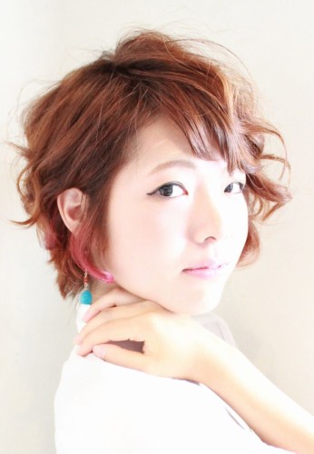 ポイントカラーがアクセントになったウェーブショートです☆ショートスタイルは、カットできっちりシルエットをつくり、パーマがおススメ(^^)/カラーはオレンジショコラに、右の内側のみバブルガムピンクをいれて遊び心を☆ - 【スタイルメニュー】